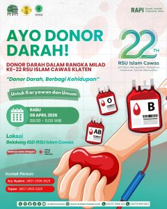 Dalam rangka Milad ke-22 RSU Islam Cawas , mari berbagi kehidupan melalui setetes darah β€οΈ Setetes darah yang Anda donorkan dapat menyelamatkan nyawa sesama.