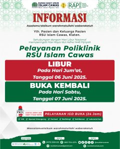 Sehubungan dengan ๐™ƒ๐™–๐™ง๐™ž ๐™‡๐™ž๐™—๐™ช๐™ง ๐™‰๐™–๐™จ๐™ž๐™ค๐™ฃ๐™–๐™ก memperingati Hari Raya Idul Adha 1446 Hijriyah, kami informasikan bahwa Pelayanan Poliklinik Rawat Jalan:
