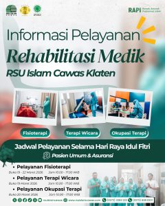 RSU Islam Cawas tetap melayani Fisioterapi, Terapi Wicara, dan Okupasi Terapi selama periode Hari Raya Idul Fitri bagi pasien umum dan asuransi.