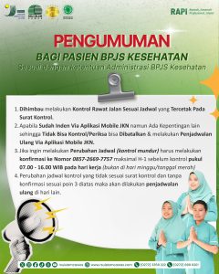 Perlu diketahui bahwa kunjungan kontrol ke poli Spesialis/Pasca rawat harus sesuai dengan tanggal yang tertera pada surat kontrol (SKDP). Ketentuan ini mengacu pada regulasi BPJS Kesehatan demi optimalisasi pelayanan rawat jalan.