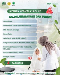 Kini tak perlu bingung mencari tempat pemeriksaan yang lengkap dan terpercaya. RSU Islam Cawas menyediakan layanan MCU Calon Jamaah Haji & Umroh dengan pemeriksaan komprehensif, tenaga medis profesional, serta pelayanan ramah dan islami.