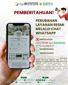 Kami informasikan mulai 16 Juli 2025 RSU Islam Cawas telah mengganti saluran Informasi Whatsapp yang semula 085173142274 menjadi 085187554954 dan 085187554955. Nomor tersebut telah menjadi nomor layanan yang berlaku resmi melalui Aplikasi Whatsapp, dan dengan adanya logo RSU Islam Cawas pada Foto Profil Whatsapp menandakan segala informasi yang kami berikan melalui saluran ini bersifat Resmi. Jika ada informasi melalui Aplikasi Whatsapp yang mengatasnamakan RSU Islam Cawas selain dari nomor tersebut, maka kami tidak bertanggungjawab atas validitas informasi tersebut.